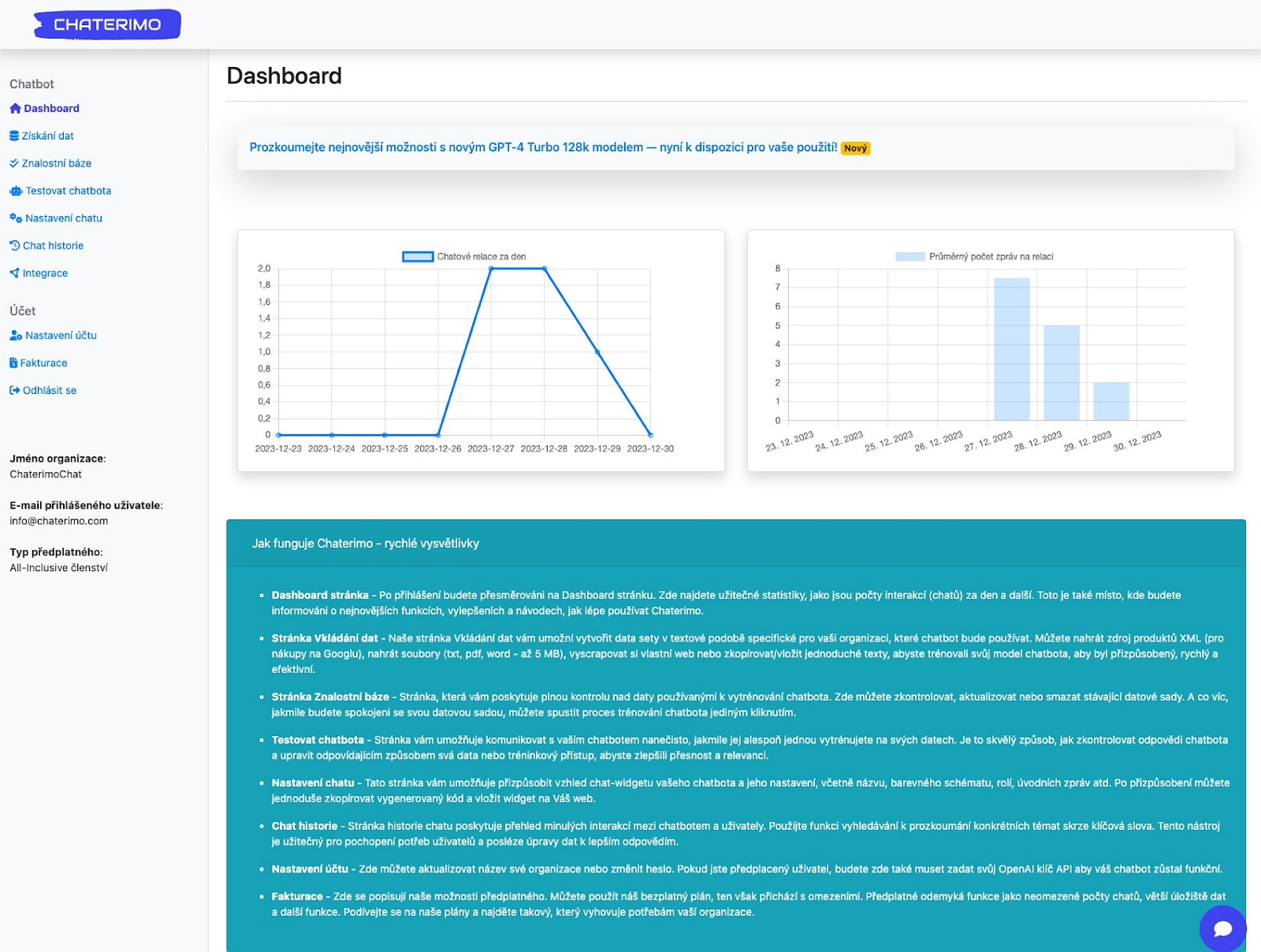 - Chaterimo umožňuje napojení na různé generativní AI modely (ChatGPT, Claude, Gemini) a nabízí možnost provozovat více chatbotů a jazyků v jednom účtu, což je ideální pro e-shopy s mezinárodním přesahem.