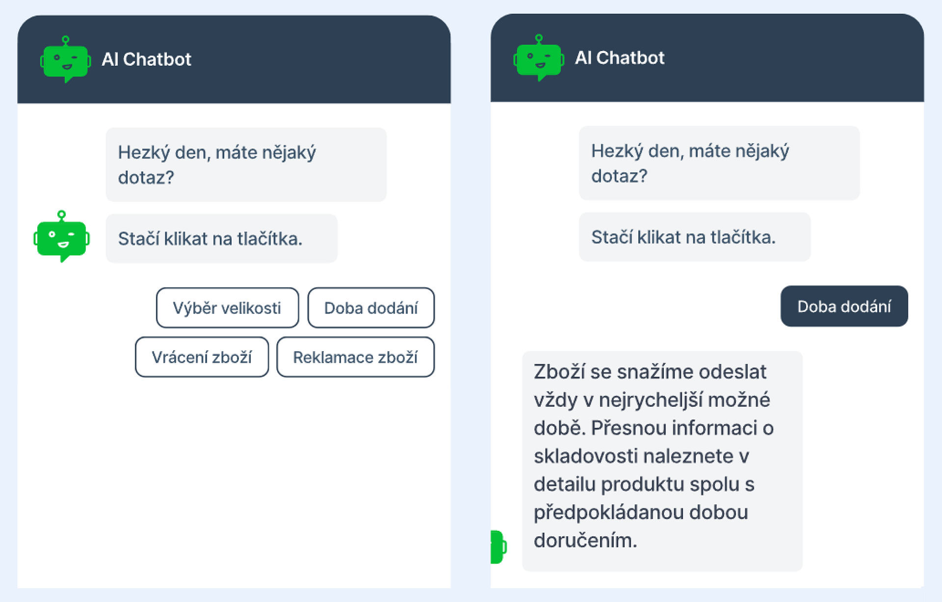 - Nepřetržitě dostupný AI chatbot, který řeší problémy návštěvníků vašeho e-shopu. K dispozici je jak v tlačítkové variantě s určitými scénáři a otázkami, tak ve formě pokročilého chatbota, který reaguje na základě dodaných podkladů.