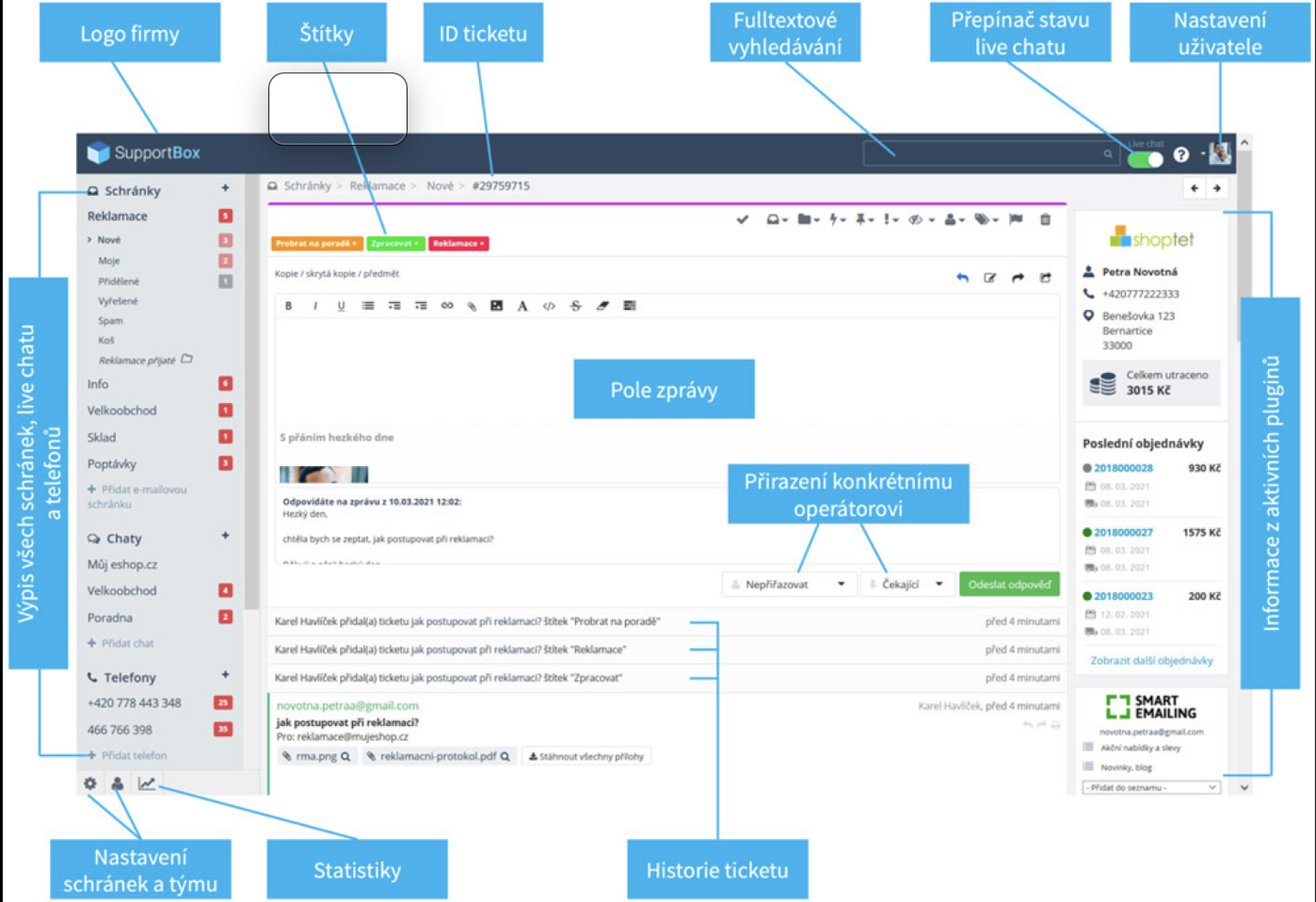 - Jednotnou schránku – u každé zprávy vidí pracovníci podpory historii zákazníka, tedy objednávky, částky či obsah poslední objednávky.