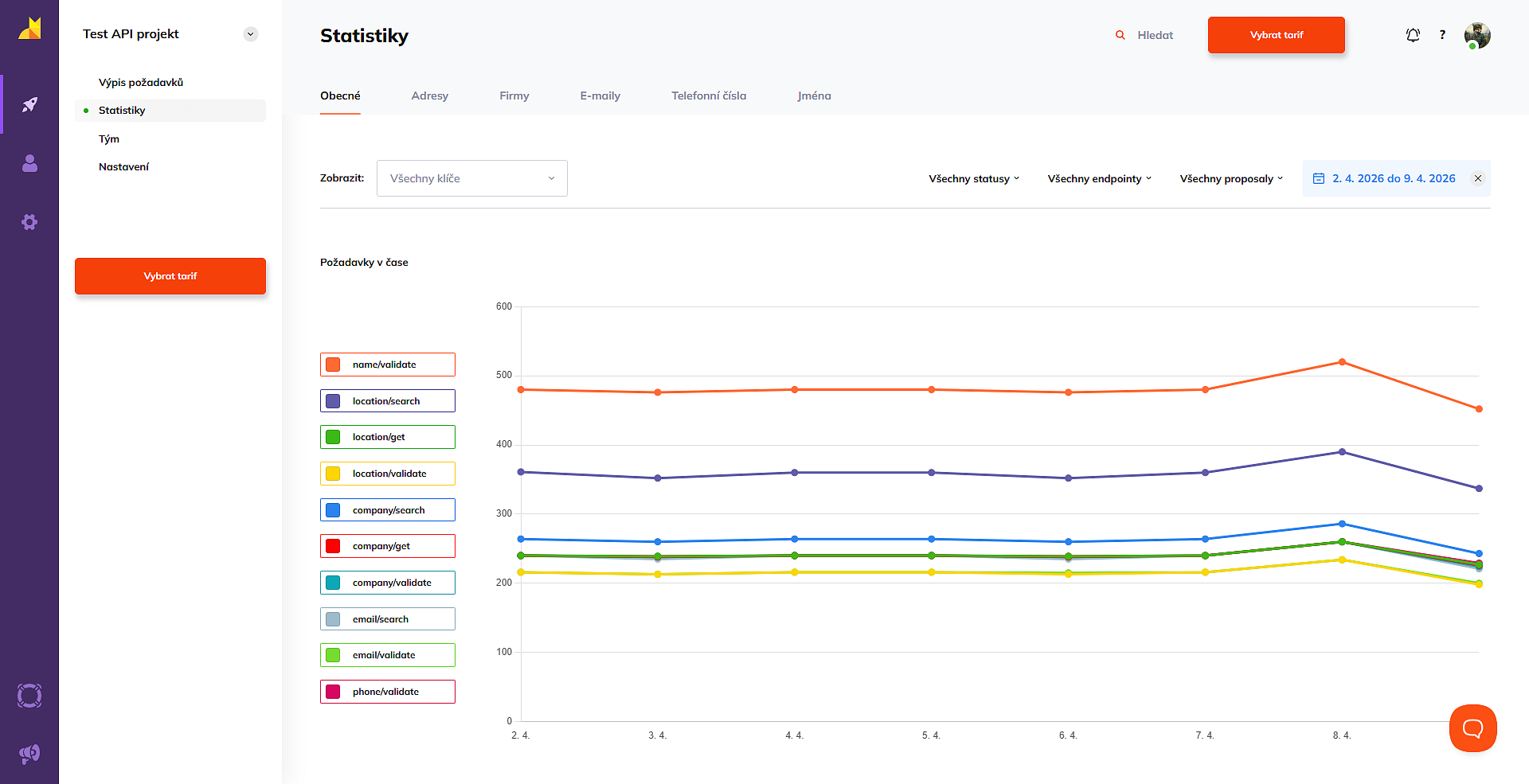 - Filtr podle klíčů: umožňuje sledovat statistiky pro konkrétní API klíč (např. oddělit testovací prostředí od produkčního),