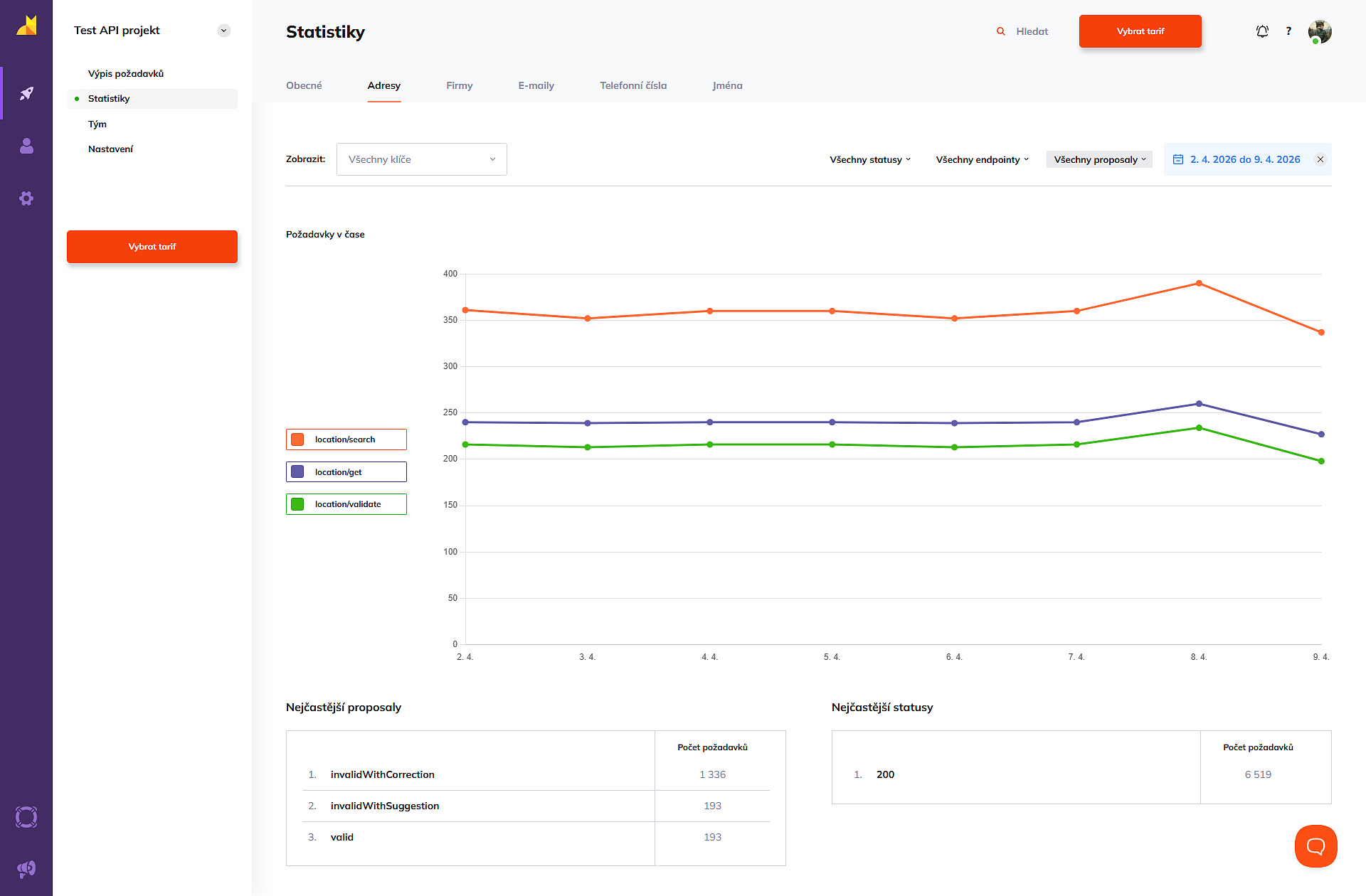 Sledujte poměr mezi valid a invalid požadavky. Vysoké procento automatických oprav (invalidWithCorrection) u API projektů znamená, že Foxentry úspěšně čistí vaši databázi od nečistot, které by jinak skončily ve vašem systému.