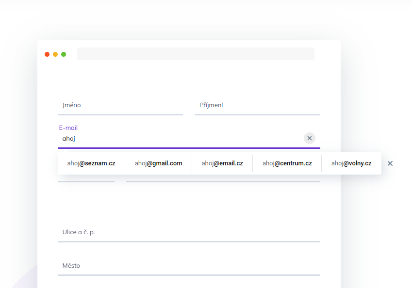 Zjednodušte svým zákazníkům vyplňování kontaktních údajů. Náš našeptávač e-mailových domén po zadání první části e-mailu (před zavináčem) okamžitě nabídne ty nejpoužívanější poskytovatele. Nákupní proces tak zrychlíte, zlepšíte uživatelský zážitek a minimalizujete riziko překlepů.
