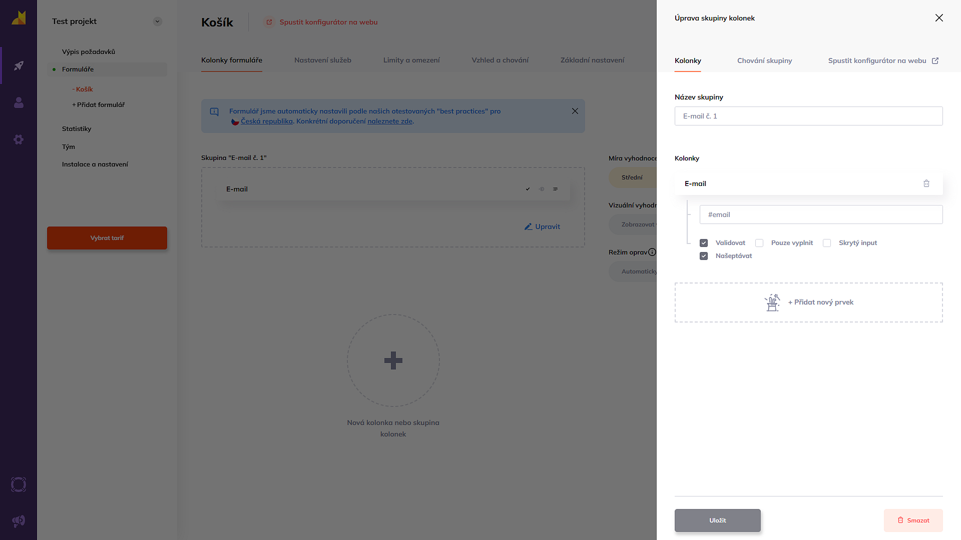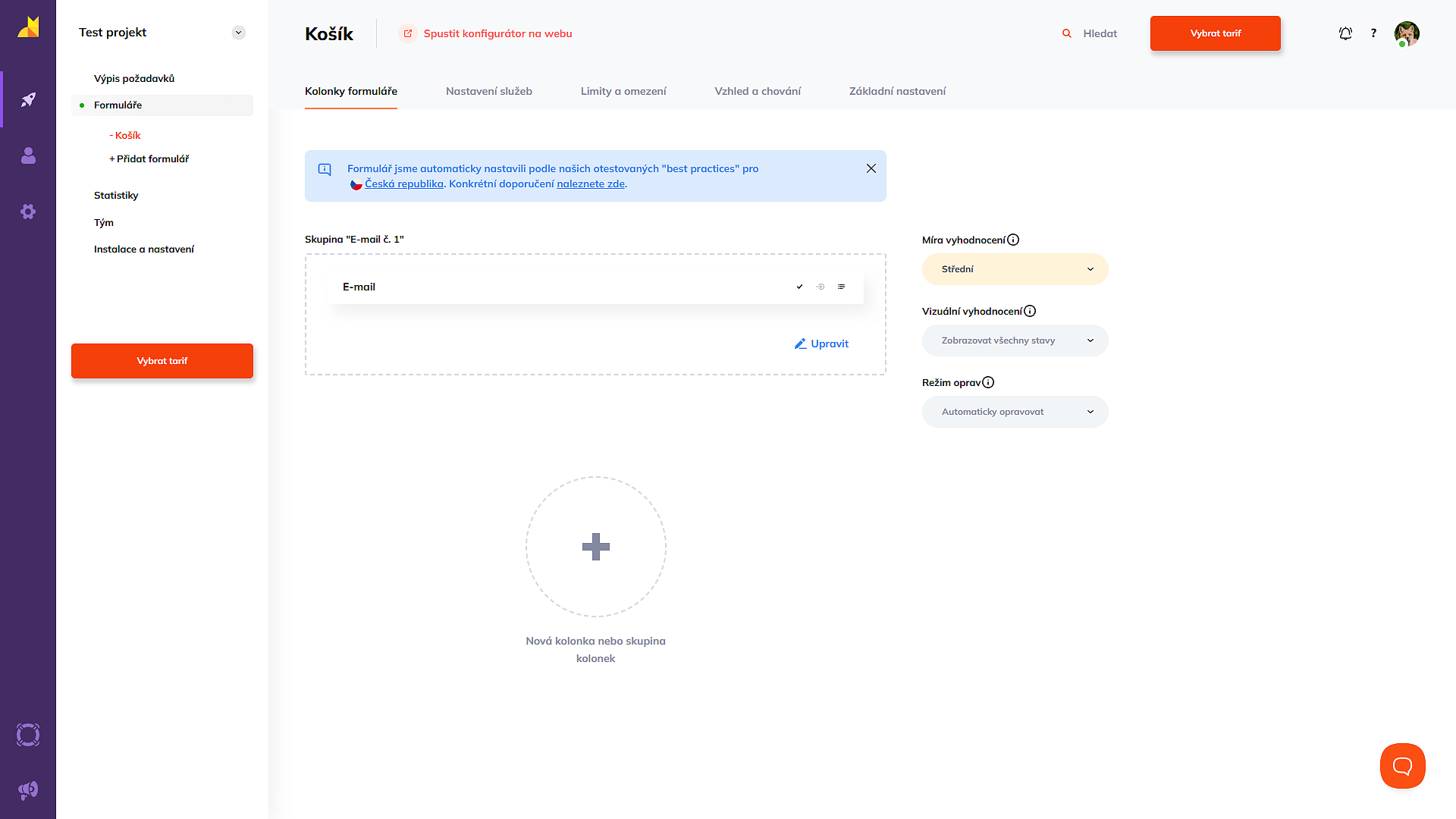Základem je opět rozdělení údajů do tzv. skupin. U e-mailu jde typicky o skupinu s jednou jedinou kolonkou. Foxentry vám i zde může nabídnout automatické přednastavení podle našich otestovaných doporučení („best practices“) pro konkrétní trhy, o čemž vás informuje modrý banner nad seznamem kolonek.