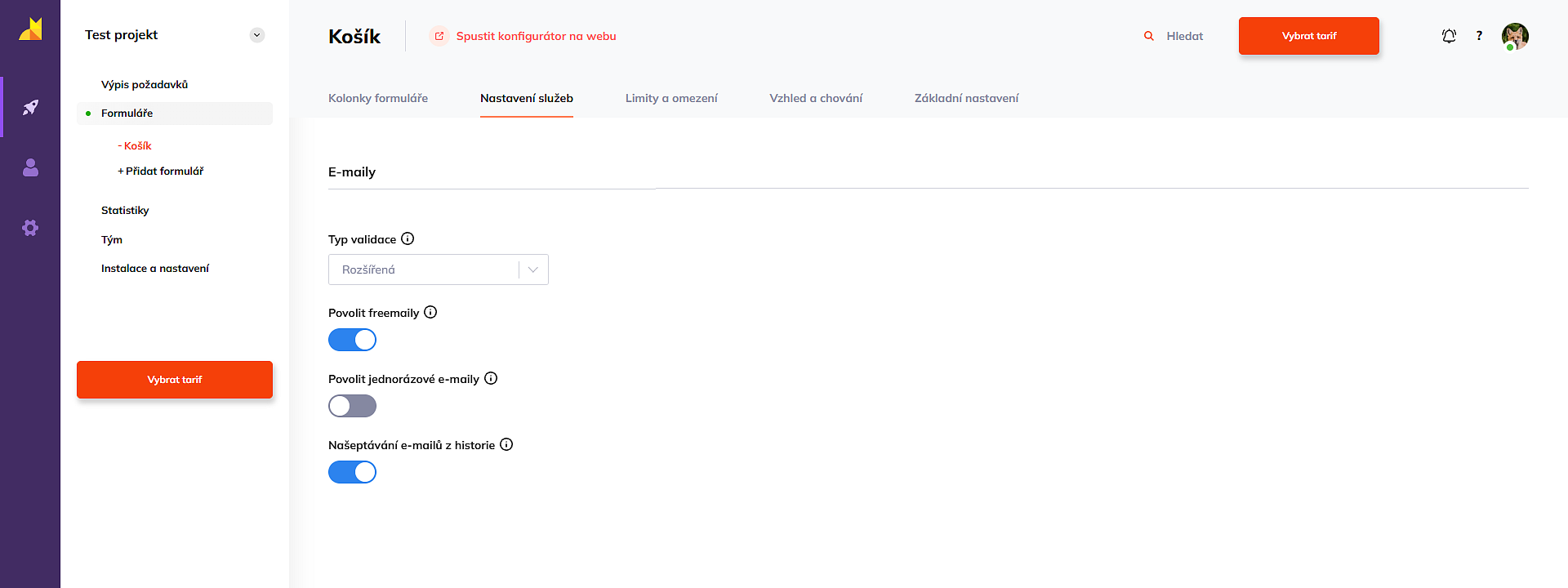 - Povolit freemaily: pokud toto nastavení vypnete, všechny běžné bezplatné adresy (jako je gmail.com, seznam.cz, yahoo.com atd.) budou vyhodnoceny jako nevalidní. Systém uživatele upozorní, ať zadá firemní e-mail. Jde o skvělou funkci zejména pro čistě B2B weby a aplikace.