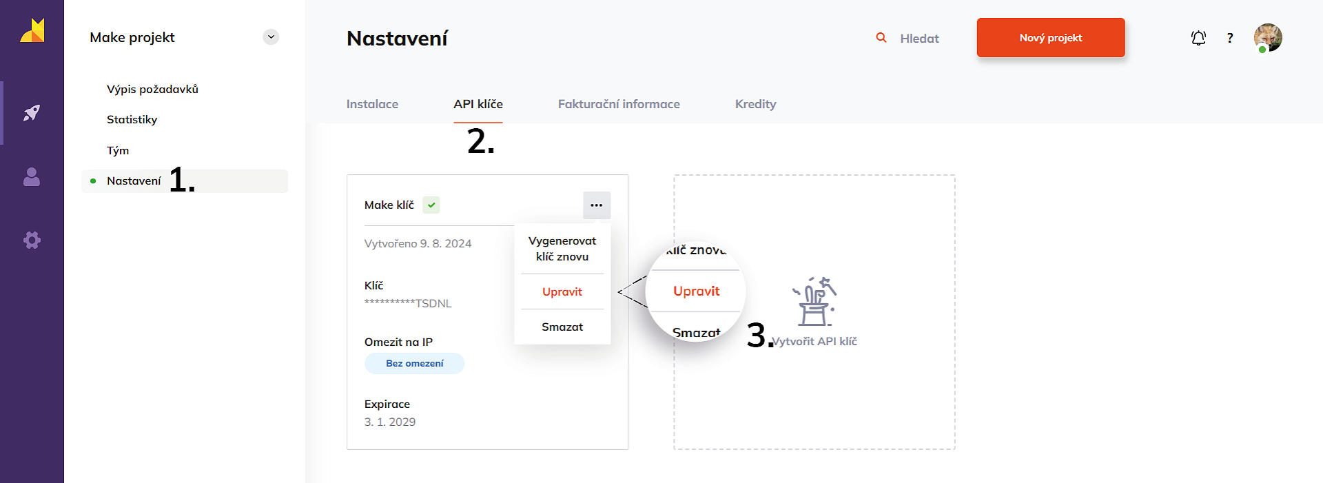 - V detailu projektu klikněte na Nastavení (1.). Poté na sekci API klíče (2.). Zde najeďte na ... v pravém horním horu vašeho API klíče a klikněte na možnost Upravit (3.).