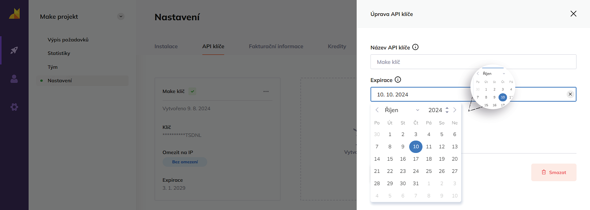 - V detailu API klíče klikněte do políčka Expirace.