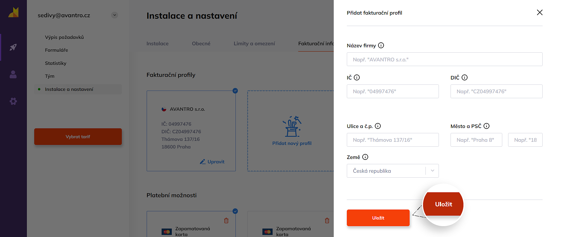 - Do otevřeného menu zadejte nové fakturační údaje a dejte Uložit.