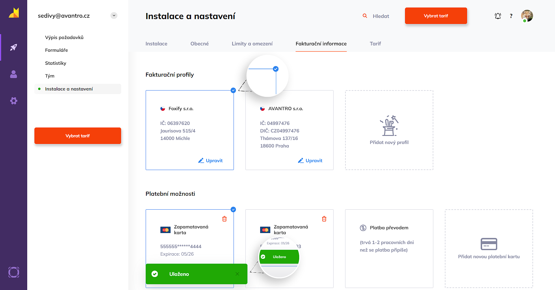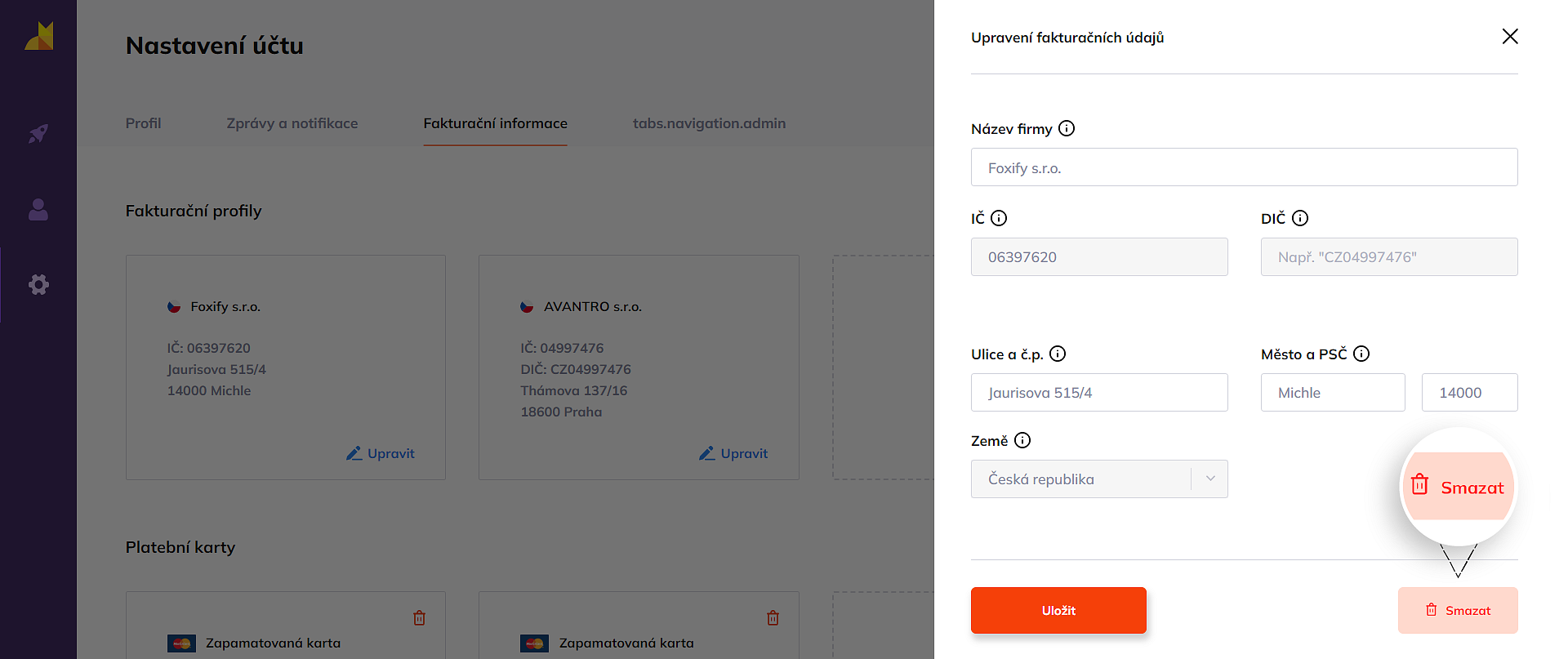 - V obou případech můžete v otevřených menu upravit či přidat nové fakturační údaje. Změny potvrďte tlačítkem Uložit.