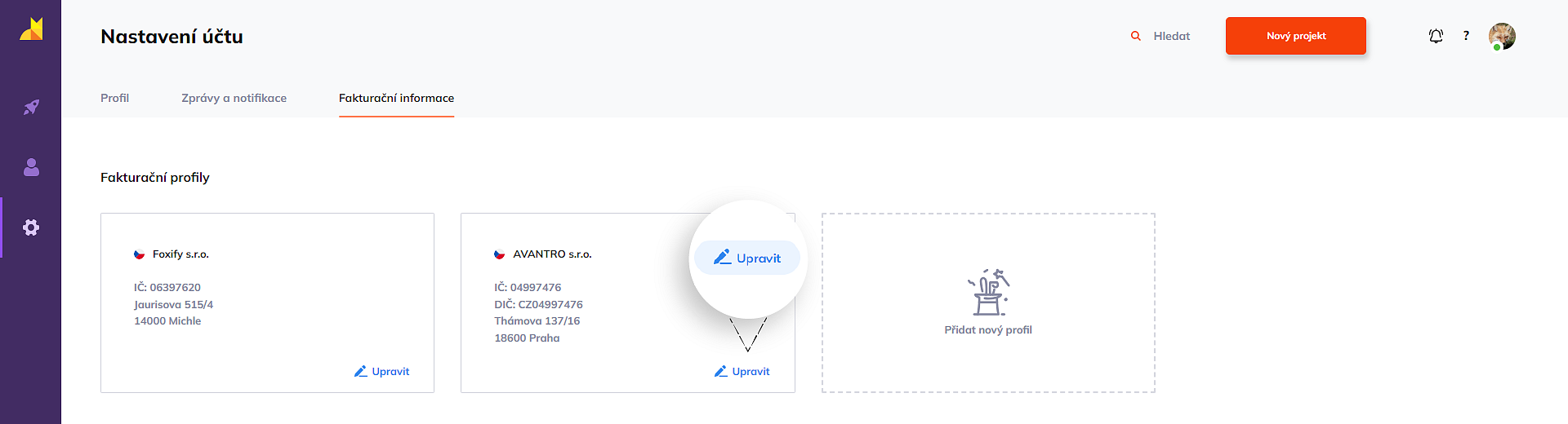 Do nastavení fakturačních profilů se dostanete buď přes sekci nastavení, nebo přímo v nastavení fakturace konkrétního projektu.
