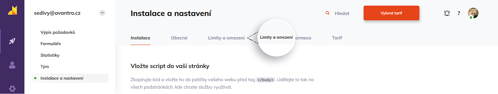 - Nyní zvolte Limity a omezení.