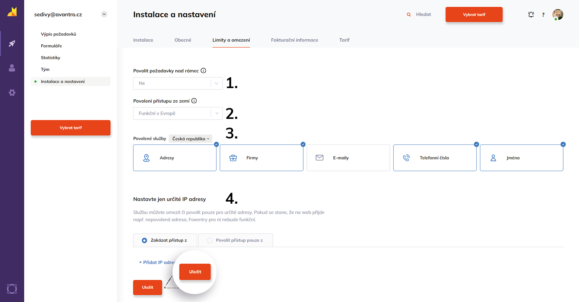 U každého projektu máte možnost nastavit si různé podmínky omezení služeb. Tato funkcionalita je vhodná např. k omezení Foxentry podle zemí až do rozsahu nastavení jednotlivých služeb, nebo povolení požadavků nad rámec placeného tarifu. Díky těmto přizpůsobením máte také možnost využívat Foxentry pouze interně na určitých IP adresách například pro potřeby testování.