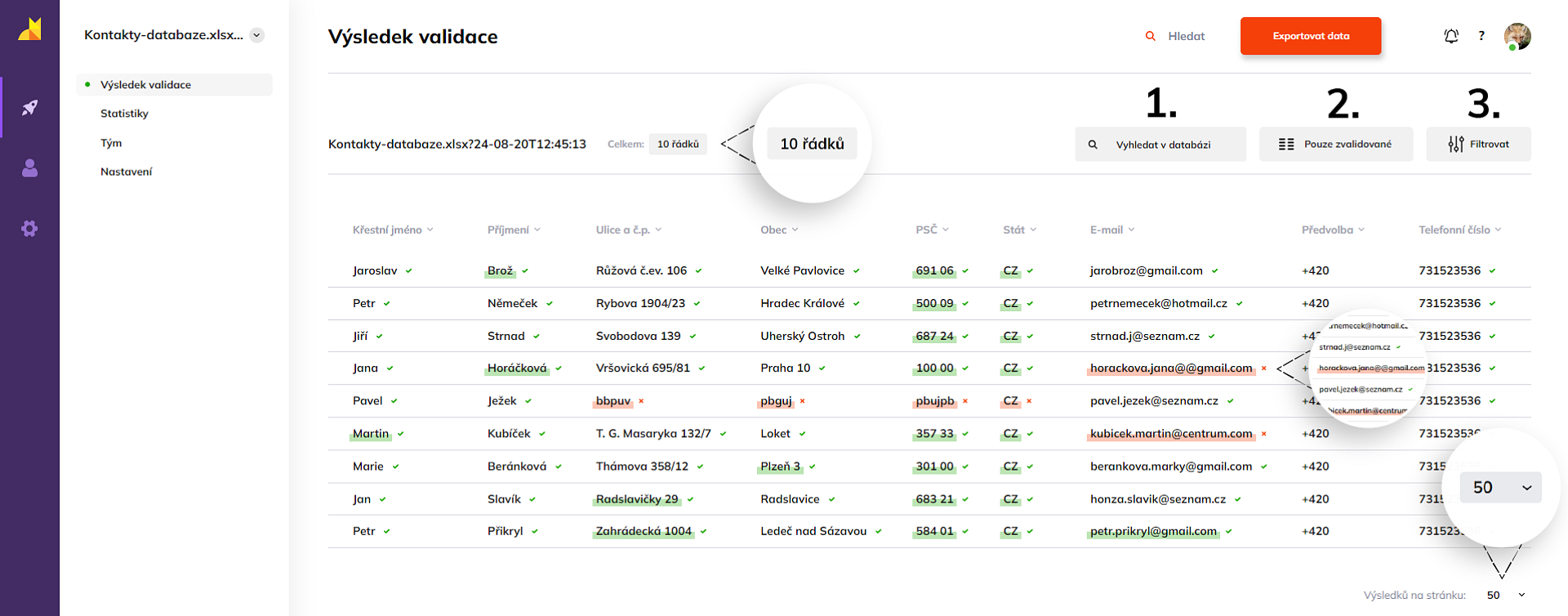 - Filtrovat (3.) vám umožnuje přidat různou komplexní podobu filtrů a podmínek pro případy, zobrazování a zpracovávání velkých databází. Díky tomu se vám budou snáze vyhledávat a identifikovat sporná a nevalidní data. Podrobnosti o filtrování výsledků se dozvíte zde.