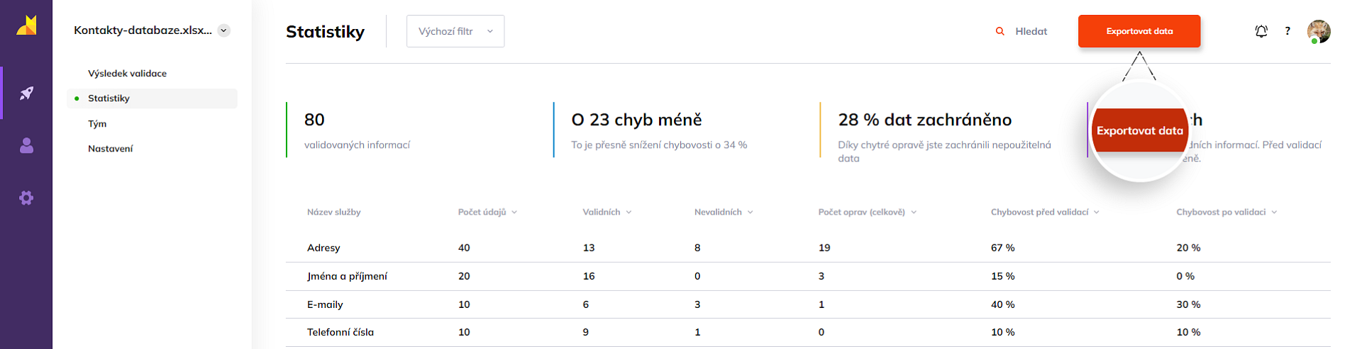- Stejně jako v předchozí sekci máte přístup k exportu validovaných dat.