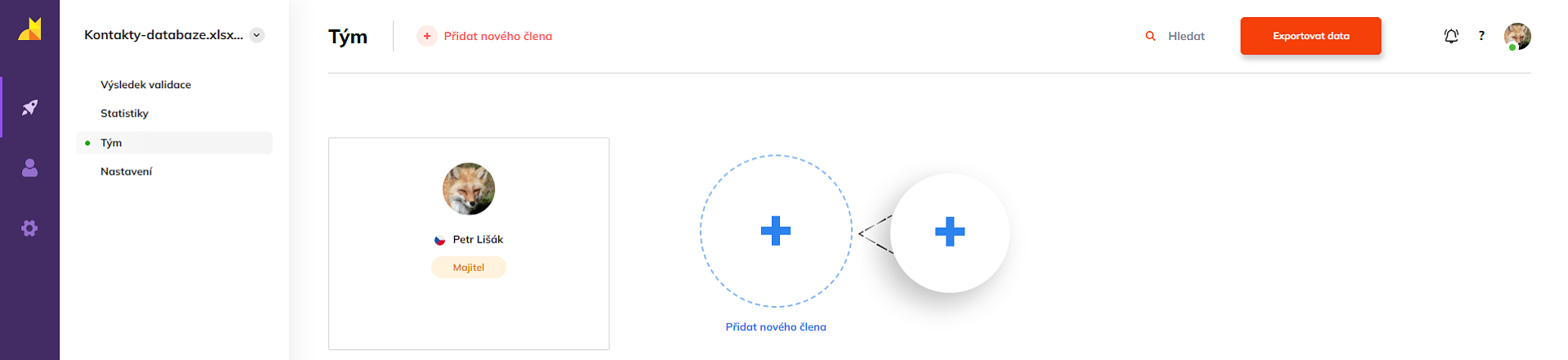 - V týmu, můžete přidávat a odebírat jednotlivé členy, kteří mají přístup do vašeho projektu.