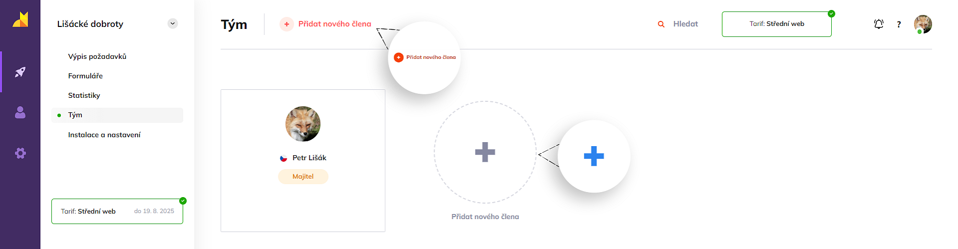 - V sekci Tým můžete přidávat a odebírat práva jednotlivých členů v projektu.