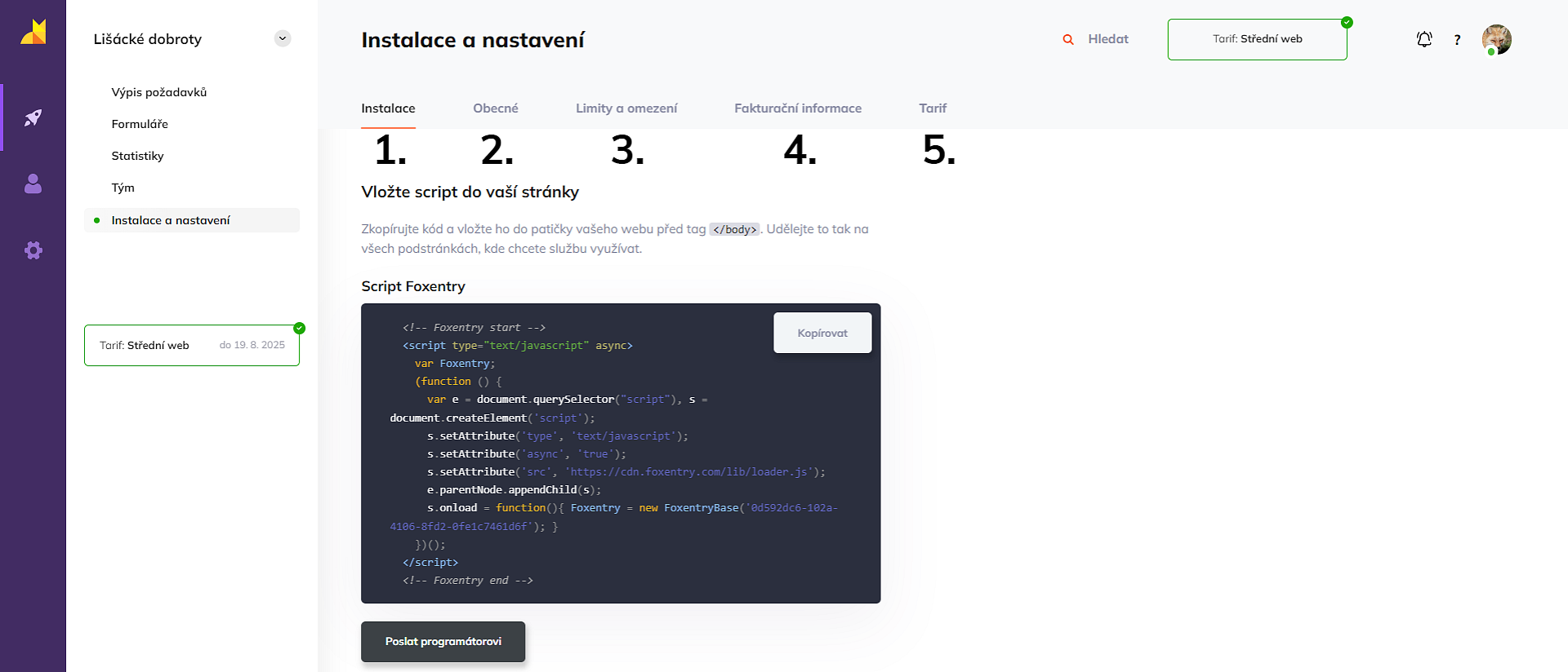 - V sekci Instalace a nastavení najdete script pro vložení do webové stránky a další podrobnosti ohledně Instalace (1.) do platforem.