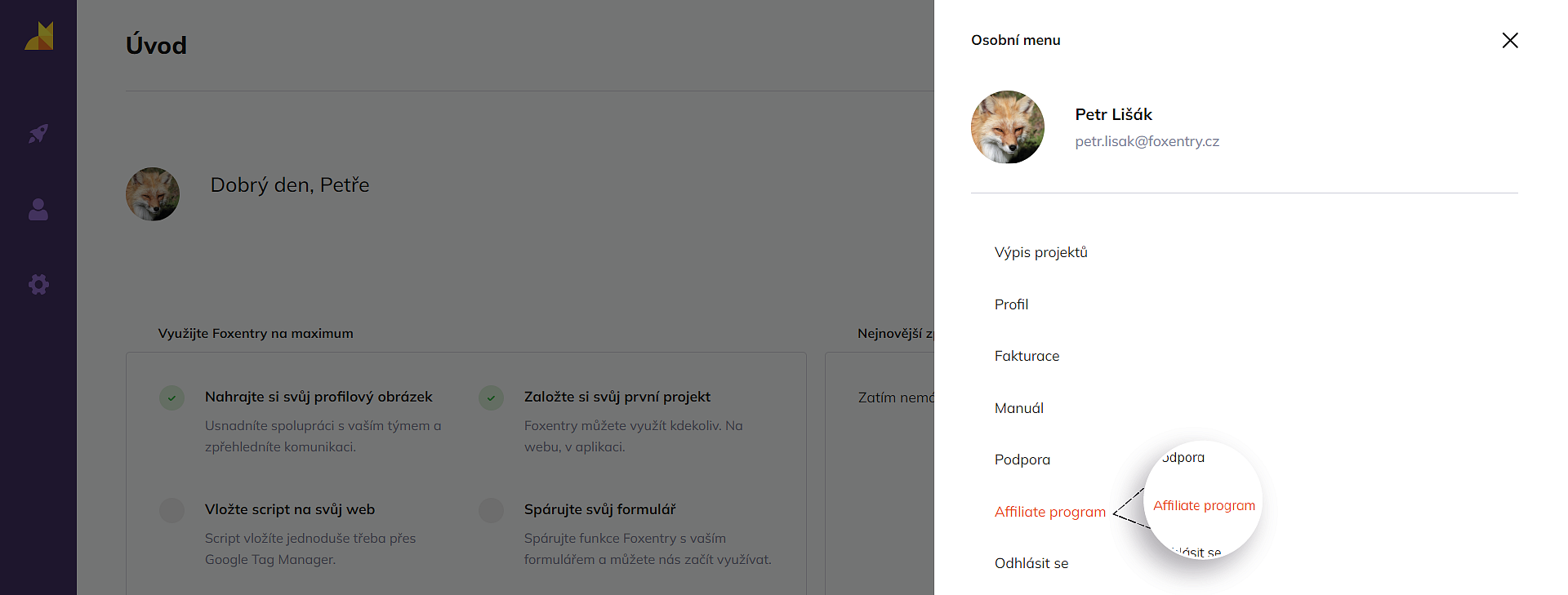 Podrobnosti o affiliate programu najdete zde. Nejdříve byste se mohli zapojit do našeho affiliate programu, je zapotřebí si udělat registraci v naší aplikaci. Díky tomu, když si klient na vaše doporučení nasadí a předplatí Foxentry, dostanete z každé jeho platby procentuální odměnu. Dokud bude klient platit, budeme platit i vám. Jak si vytvořit účet se dozvíte zde.