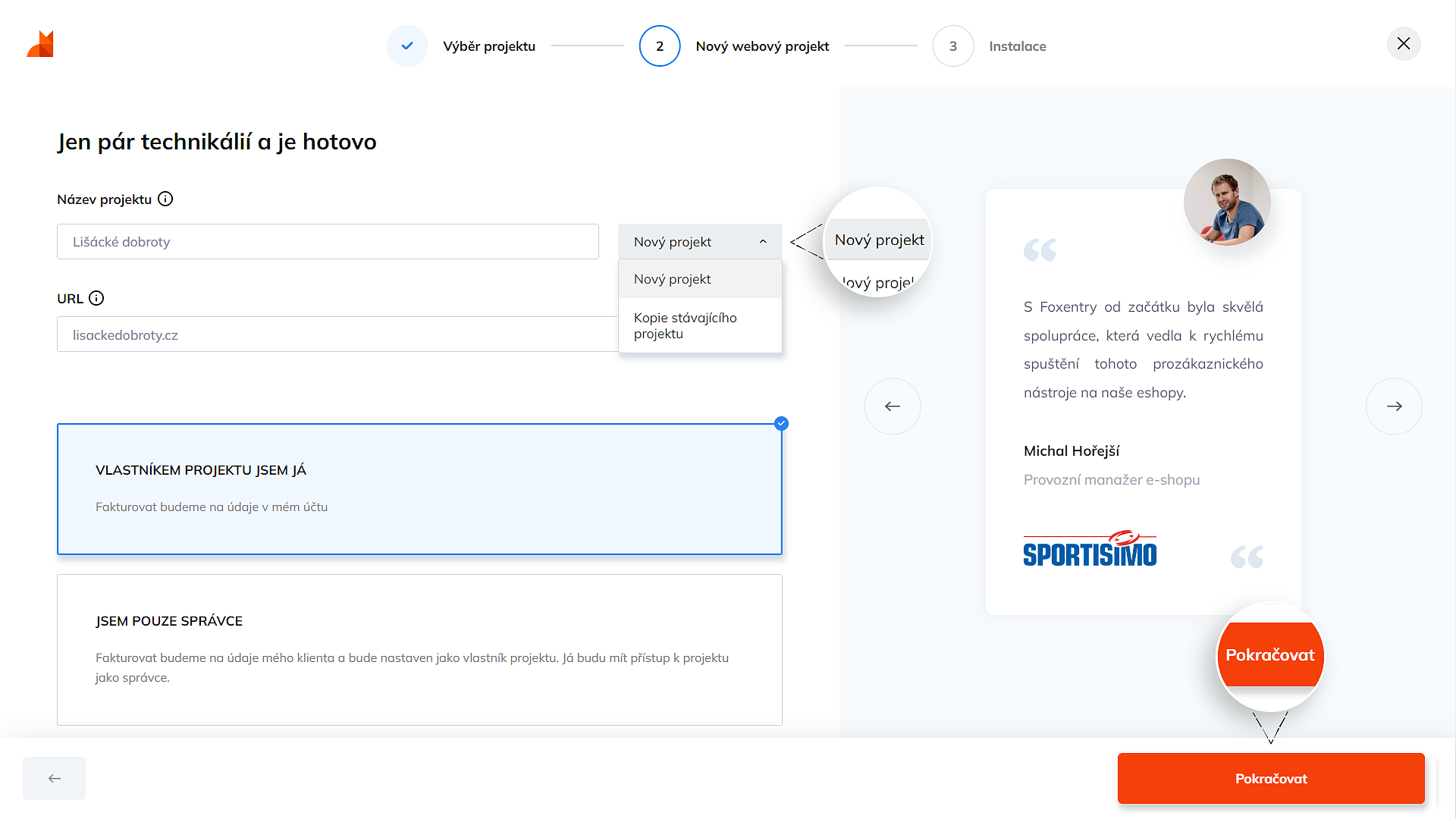 - Napište název projektu. Vyberte zdali se jedná o nový projekt, nebo chcete vytvořit kopii stávajícího projektu. Doplňte URL webové stránky, na které chcete Foxentry používat a zvolte či je projekt přímo pro vás nebo pro klienta. Podrobnosti o vytváření projektu jako správce najdete zde. Poté zvolte Pokračovat.