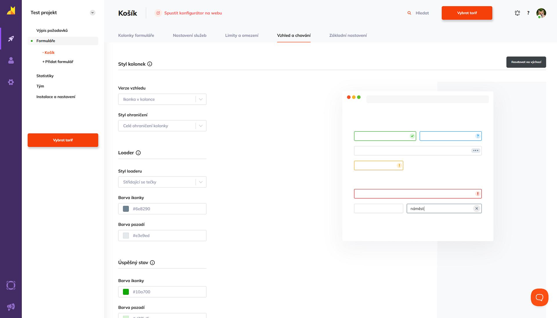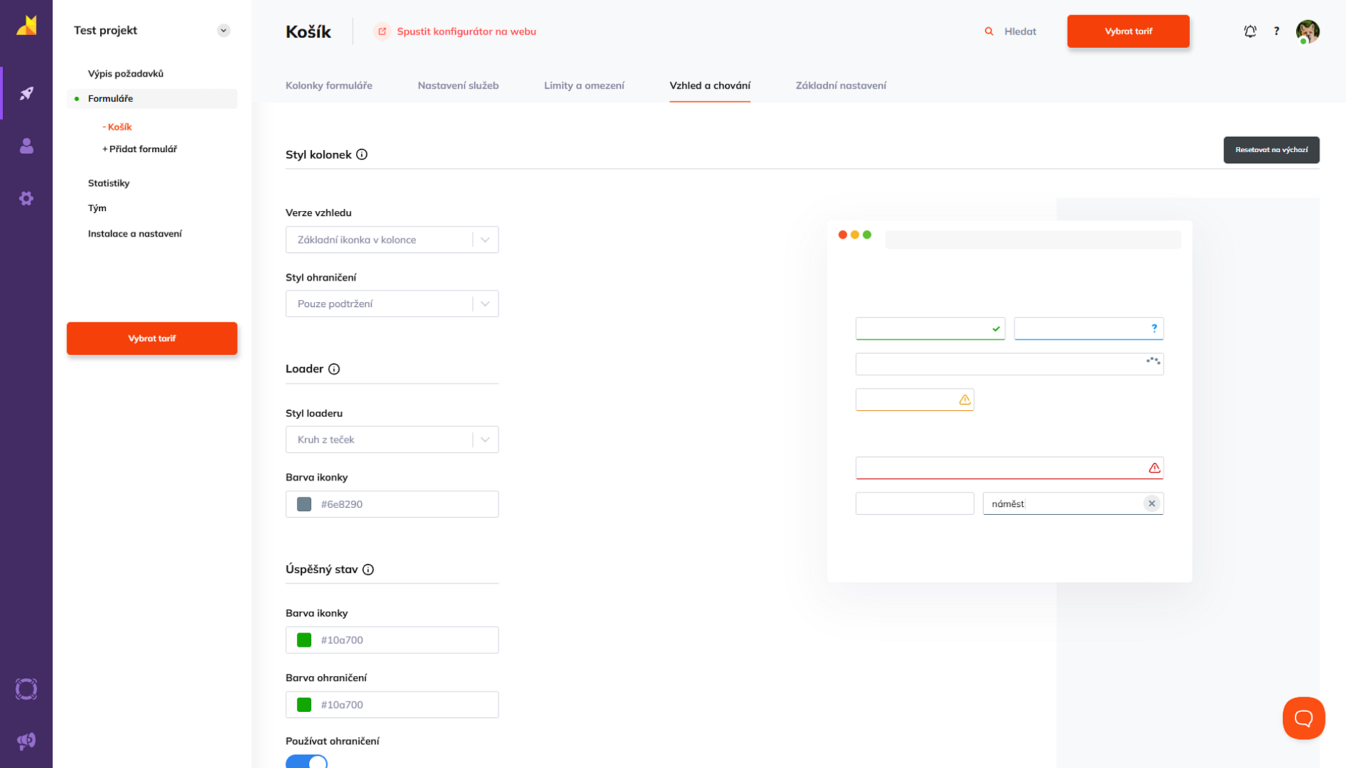 Zapadnout do designu vašeho webu je pro Foxentry hračka. V záložce Vzhled a chování si můžete barvy, tvary i umístění chybových hlášek vyladit přesně podle svého brandu. Obrovskou výhodou je interaktivní náhled na pravé straně obrazovky, ve kterém okamžitě vidíte, jak se vaše úpravy projeví v praxi.