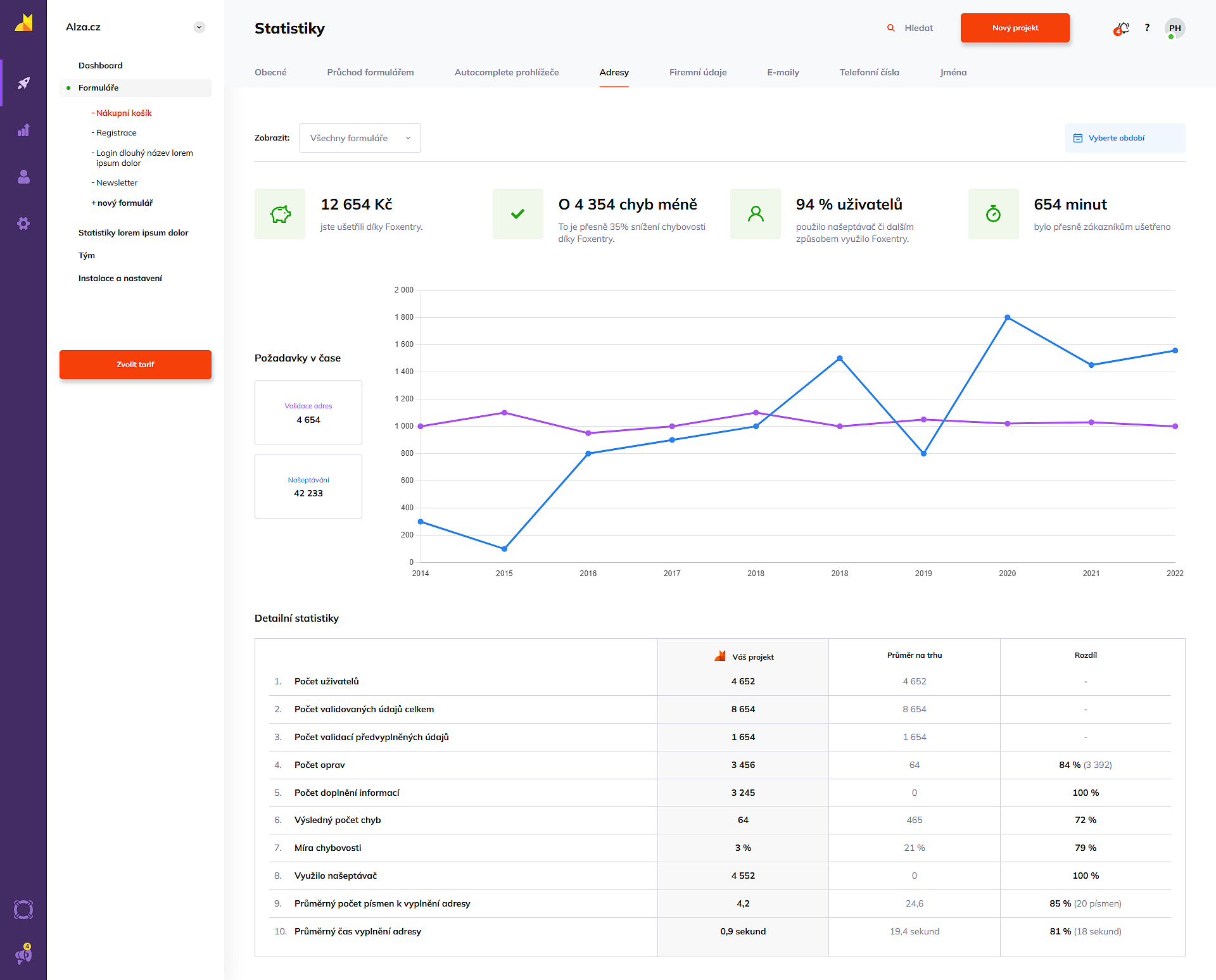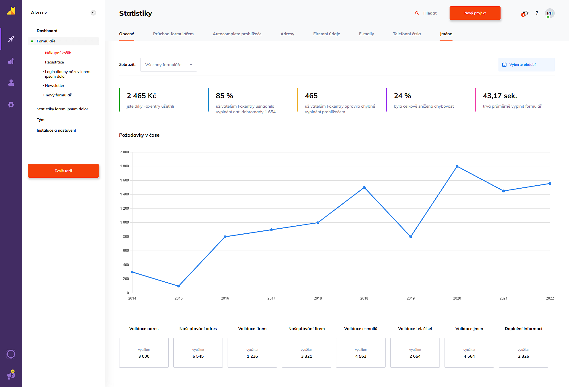 Hned po otevření sekce Statistiky vidíte souhrnné karty, které vám v reálném čase ukazují přínos Foxentry pro váš byznys. Můžete zde sledovat celkovou úsporu v korunách, snížení chybovosti v procentech nebo průměrný čas, který uživatel stráví vyplňováním vašich polí.