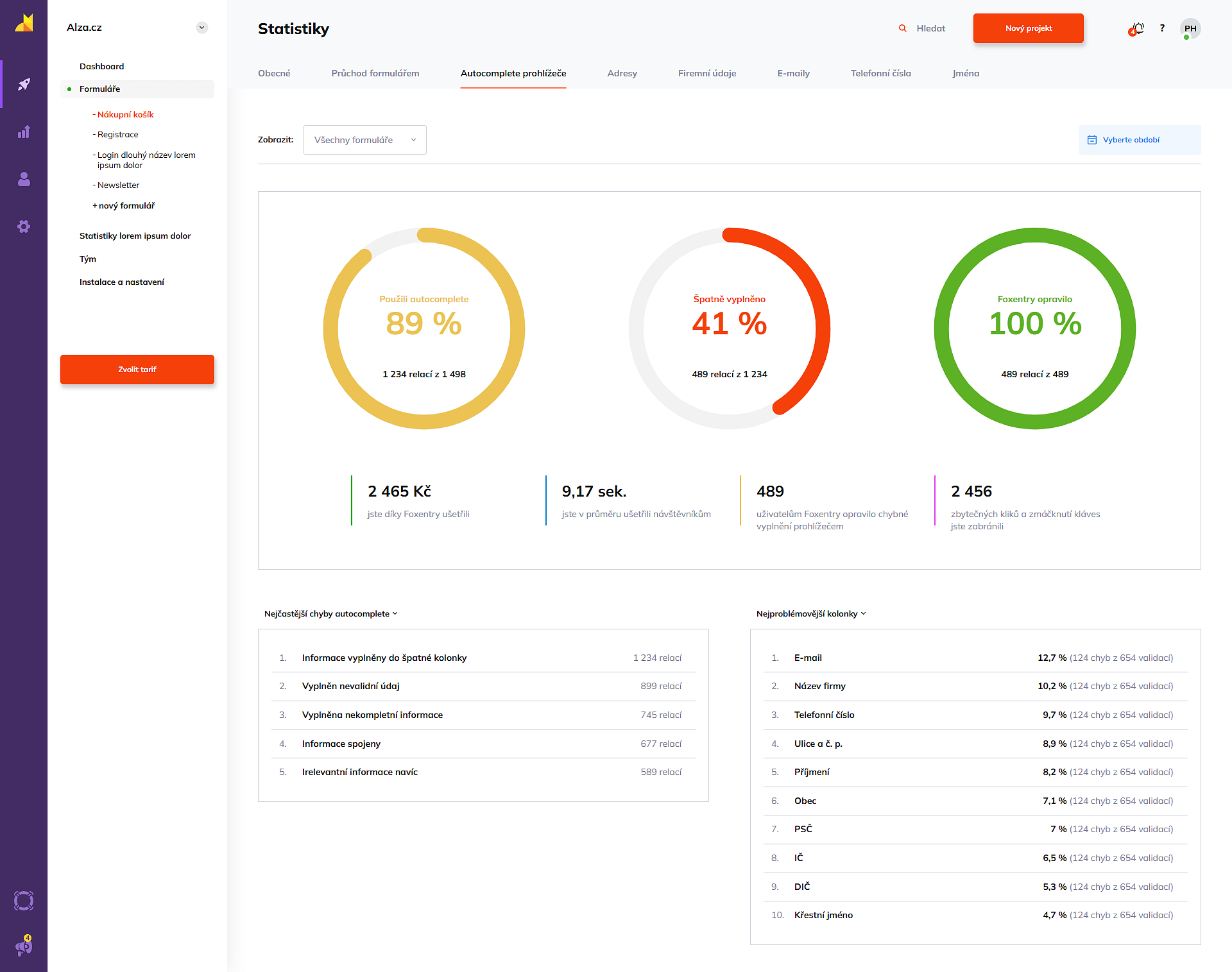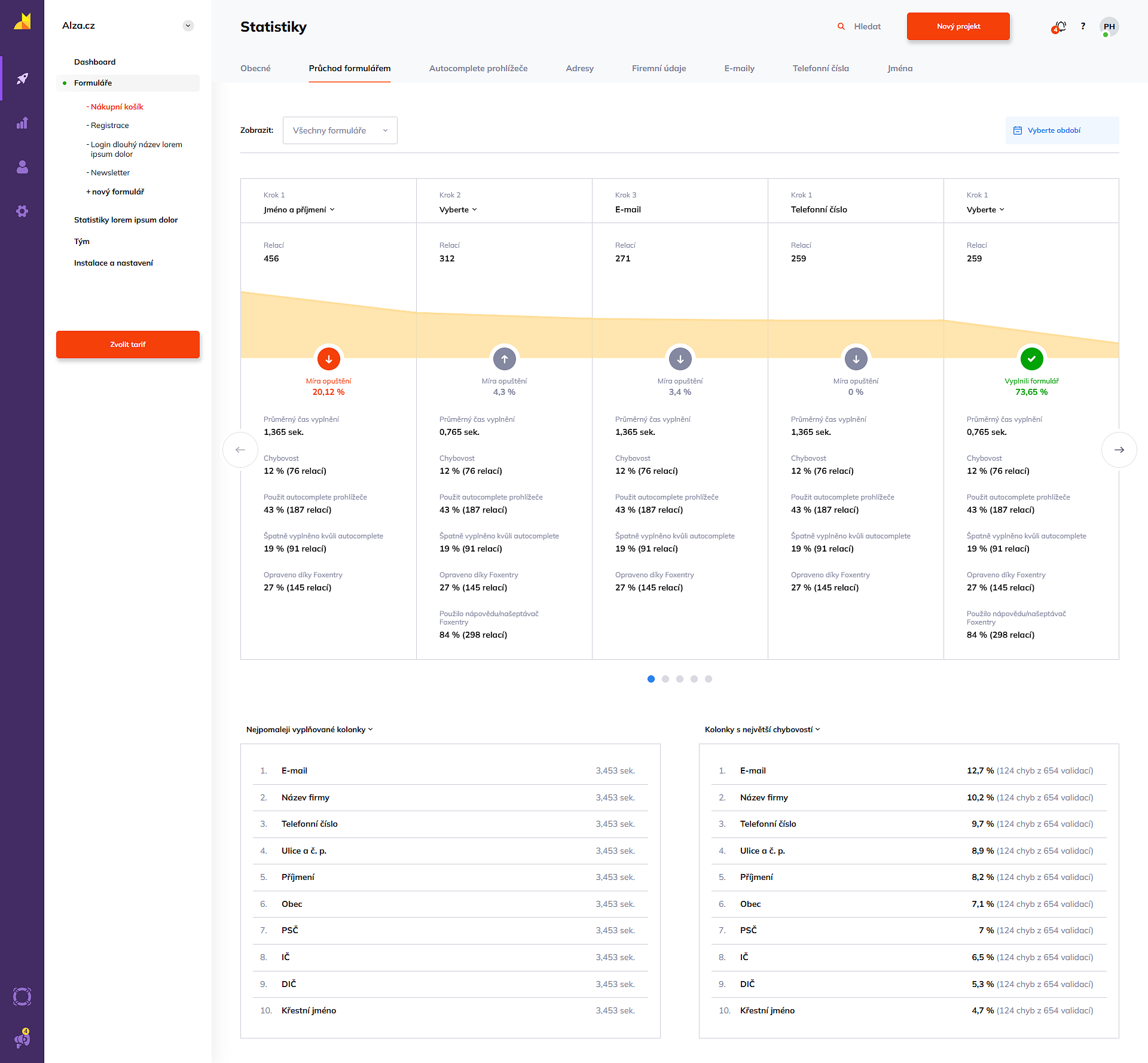 V přehledech pod grafy věnujte pozornost tabulce Nejproblémovější kolonky. Pokud má jedno pole výrazně vyšší chybovost než ostatní, může to značit špatné technické nastavení na webu nebo matoucí název políčka pro uživatele.